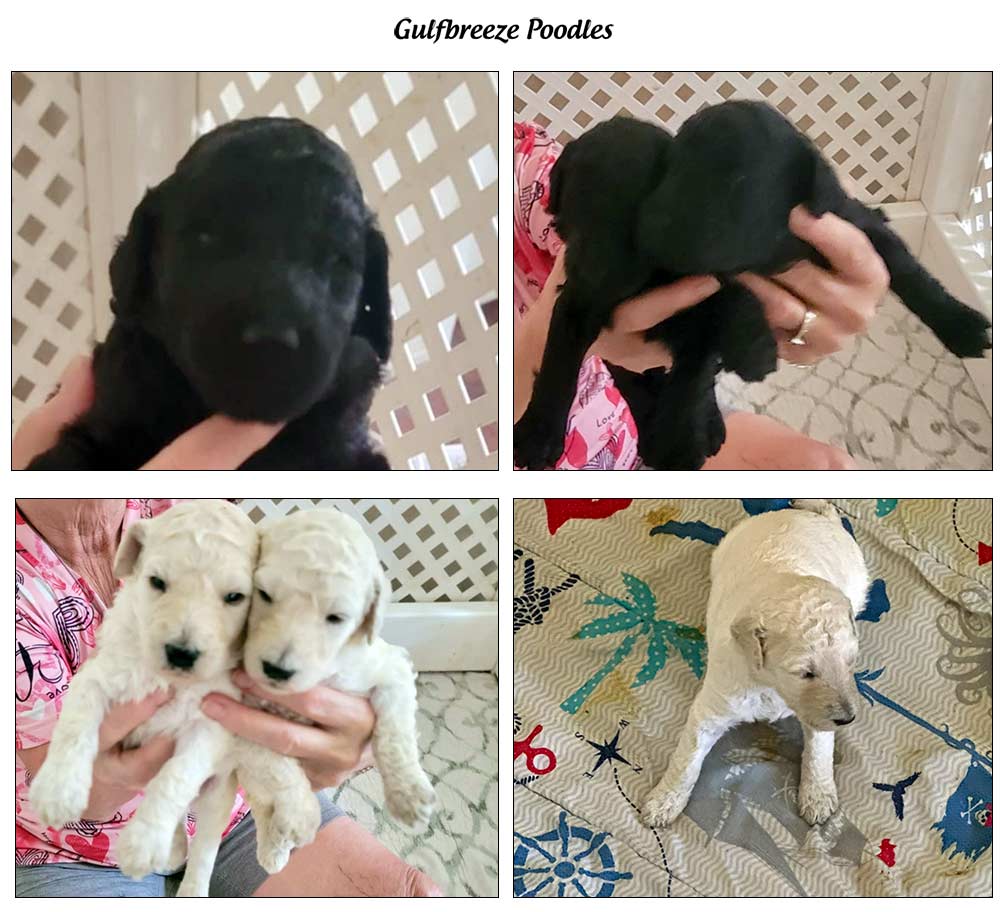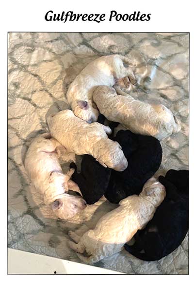 Nine fine Standard Poodle puppies were whelped by our Lucy on Friday, July 18. Available now to good homes as companions, or for conformation AKC competition titles: One black boy; one white girl.